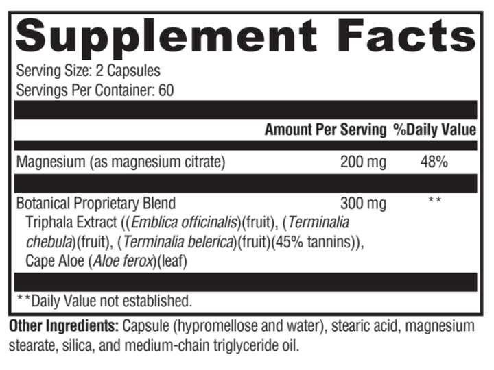 GI Move is designed to support gastrointestinal (GI) regularity and complement dietary fiber intake. Magnesium citrate is present to support muscle relaxation and bowel elimination. Cape Aloe is added to support normal GI transit time and stool bulk. Triphala, a balanced blend of astringent fruits used extensively in Ayurveda, is present to support all phases of digestion, assimilation, and elimination. Gastrointestinal regularity in turn plays a fundamental role in detoxification, providing a major route for elimination of toxins.