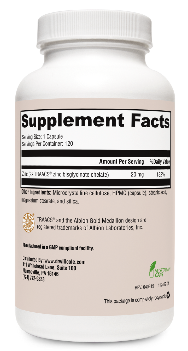 The Zinc Glycinate is a fully reacted, proprietary TRAACS® amino acid chelate formulated for enhanced absorption. As an essential mineral, zinc serves catalytic, structural, and regulatory functions in the body. Zinc ultimately supports immune and neurological function, growth, taste acuity, nutrient metabolis